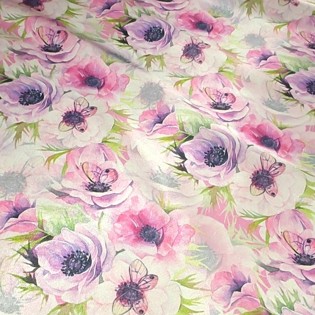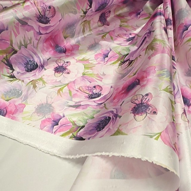 - Атлас с блеском Кристалл с принтом бабочки на анемонах для пошива нарядных платьев